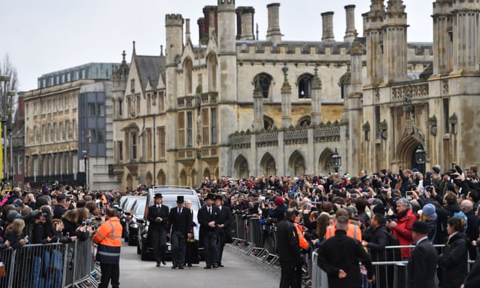 The crowd, waiting to pay their respects to a man who died at the age of 76 but had not been expected to live beyond his 20s, broke into spontaneous applause as shortly after 2pm Hawking’s coffin was carried aloft into the church of St Mary the Great, a stone’s throw from Gonville and Caius college where he had been a fellow for more than half a century.
