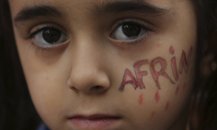 A Kurdish girl who lives in Cyprus, stands with her face painted during a protest against the Turkish offensive targeting Kurds in Afrin, Syria. Photograph: Petros Karadjias/AP