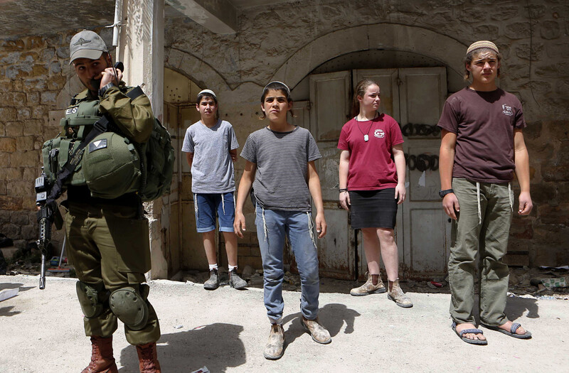 An Israeli soldier guards a group of Israeli settlers standing in front of a Palestinian house after they occupied the building the previous night near the Ibrahimi mosque in the occupied West Bank town of Hebron on 27 March.