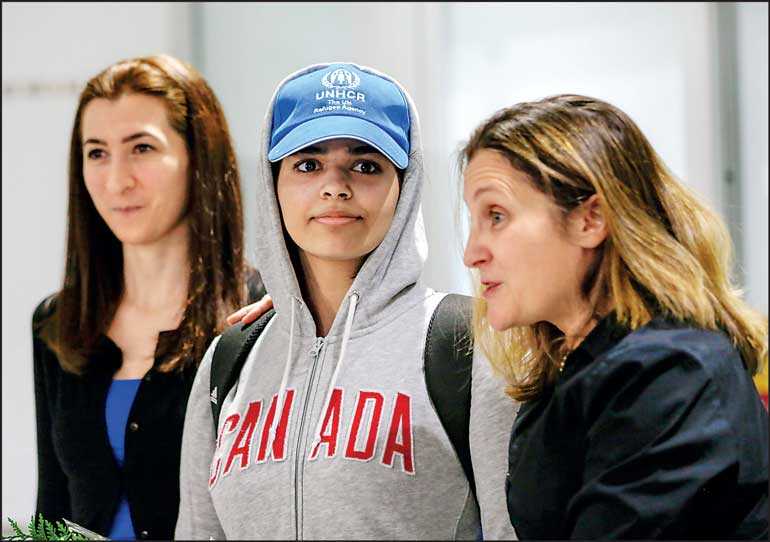 Rahaf Mohammed al-Qunun (C) accompanied by Canadian Minister of Foreign Affairs Chrystia Freeland (R) and Saba Abbas, General Counsellor of COSTI refugee service agency, arrives at Toronto Pearson International Airport in Toronto, Ontario, Canada 12 January – Reuters