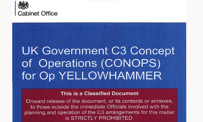 Nick Hopkins-The Cabinet Office’s Operation Yellowhammer manual in preparation for a no-deal Brexit. Photograph: Cabinet Office