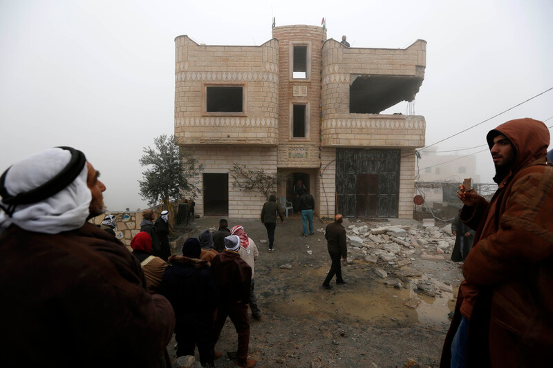 Palestinians stand in front of a home belonging to the family of a teen accused of stabbing and killing an American settler in the West Bank last September, after the home was partially demolished by Israeli soldiers in the village of Yatta, southern West Bank, on 18 January.APA images