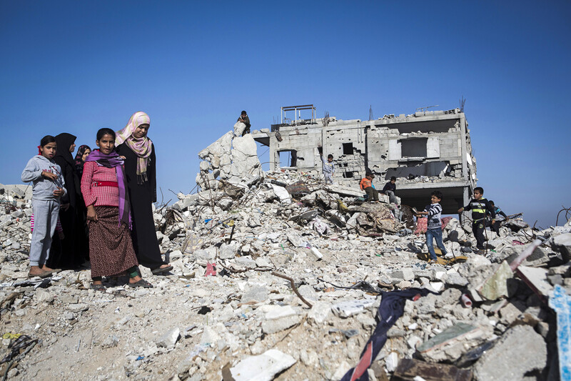 Palestinians stand on the rubble of a home in Beit Hanoun, northern Gaza Strip, in November 2014. Eight members of the Wahdan family were killed in an airstrike on the home during Israel’s 51-day assault on Gaza earlier that year.