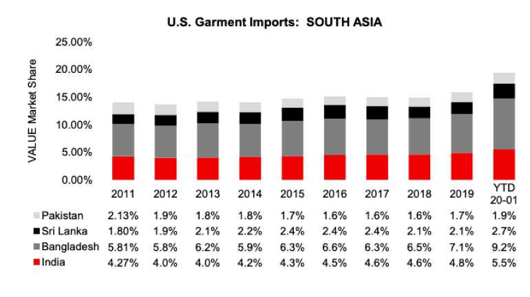 While Sri Lanka generates revenue of $ 5.5 b, the net contribution is around 55% [$ 3 b] Sri Lanka relies extensively on its raw materials from other regions, where 40% of fabric and accessories are imported from China, even though they are known as an expensive hub with wage costs being twice as much as Sri Lanka.