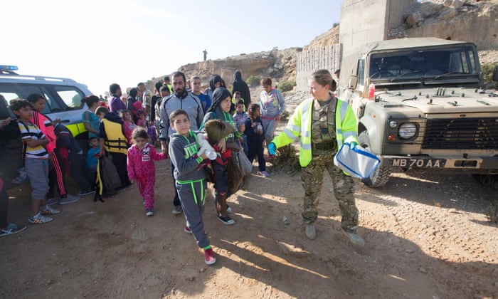 Refugees arriving at RAF Akrotiri in Cyprus, after being abandoned in fishing boats offshore. They were described as very well dressed and without any health concerns. Photograph: SAC Laura Wing/Ministry of Defence