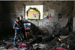 Children stand in the burnt home of the Dawabsheh family before the funeral ceremony of Riham, who died of her injuries more than one month after the arson attack by suspected Jewish extremists that killed her 18-month-old baby Ali and her husband Saad, 7 September.Yotam RonenActiveStills