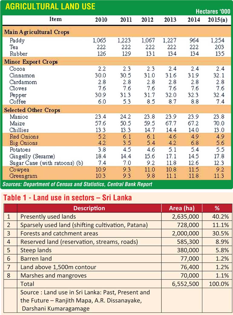 The administration and management of land in Sri Lanka is governed by more than 39 operational laws. Laws are vested with the Ministry of Agriculture, Ministry of Lands and even departments such as Irrigation Department. Currently land use policies are implemented on an ad hoc basis. There has been no recent study on land use and a mapping of agricultural land based on crops. The major drawback has been the limitation of robust data. With such reliable data future land use planning could be formulated. Innovative thinking must be utilised to achieve a reliable methodology to optimise land use.